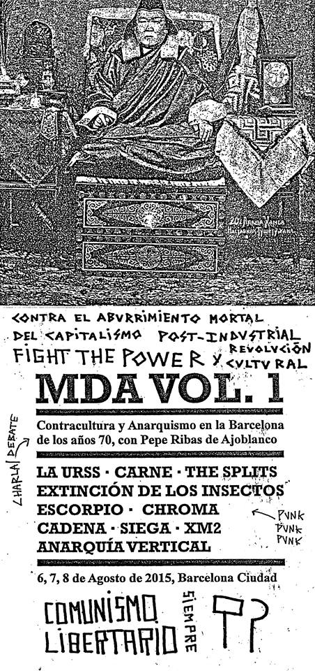 El motivo principal de la visita a Barcelona fue la presentación del nuevo número del fanzine Mierda y las jornadas «contra el aburrimiento mortal del capitalismo postindustrial» que se habían organizado para ello. El jueves había una apetecible charla sobre contracultura y anarquismo en la Barcelona de los 70’s a cargo de Pepe Ribas, editor de la revista Ajoblanco, a la que desafortunadamente no llegamos a asistir. Los dos días siguientes consistieron en un festi, con cinco bandas por día, que fueron un ejemplo de concordia y buena organización. La primera vez que cayó el fanzine Mierda en mis manos vi una visceral y subjetiva mezcla de Hc-Punk pasada por un tamiz de radicalidad política con la que me sentí más o menos identificado. De esto hace ya algún tiempo y, al menos en este último número, la música desaparece para ceder espacio a un contenido político en los mismos términos, de gran interés y lectura rabiosa, pero que se escapa un poco a los contenidos de este blog. Por eso no entraré en muchos detalles más. Tan solo mencionar un jugoso artículo sobre las publicaciones contraculturales de la España del siglo pasado, hasta casi la última década, que debería ser de obligada lectura para cualquier persona que sepa leer. Si hay alguien interesado puede hacerse con una copia en Madrid, a través de La Negra o Afeite el Perro.