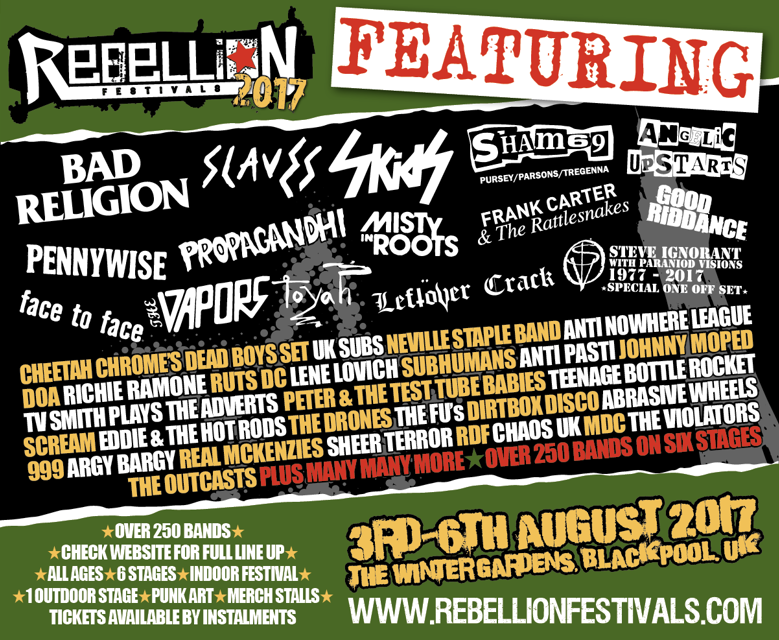 Otro año más se acerca el esperado fin de semana del Rebellion Festival. Esta vez no hay aniversario de por medio por lo que se esperaba un bajón en el cartel considerable. No ha sido así y, aunque no va a tocar hasta el apuntador como ocurrió en 2016, hay un montón de reuniones sorpresa y sets exclusivos que siguen haciendo atractivo el acercarse hacia la soleada costa de Lancashire.