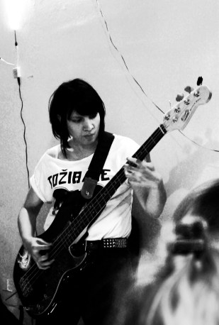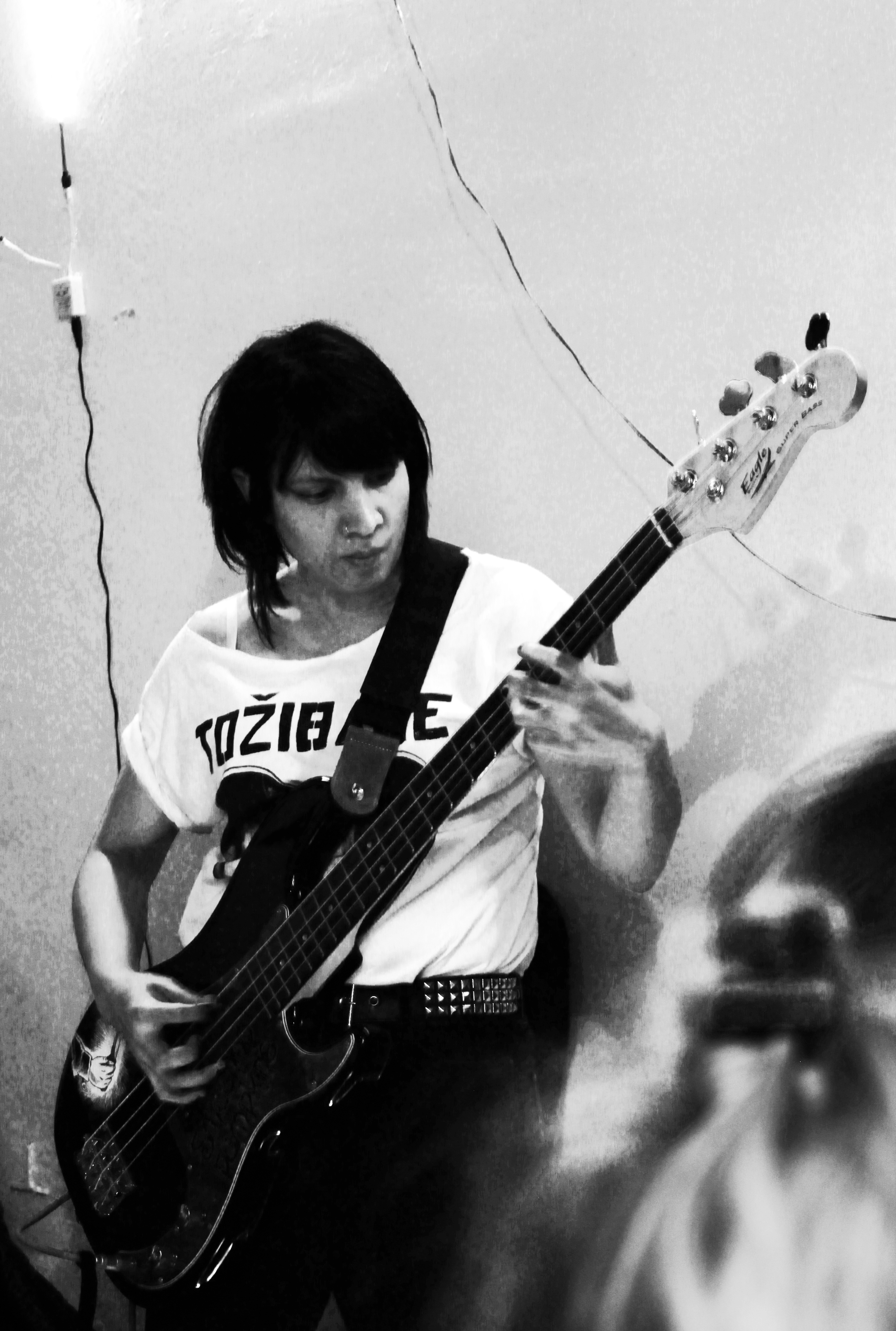 Nadia: Lo importante, antes de que te cataloguen como «banda de chicas», es si te gusta o no lo que estoy tocando. Yo creo que la razón porque se hacen esas tocadas no parte de querer separar las bandas de chicos o de chicas, sino más bien para decir -aqui estamos, y estamos haciendo esto.- Quizá también fue una manera de hacer una tocada quitándole la responsabilidad a quienes siempre las habían organizado, que eran siempre hombres. Es como si estuvieramos en un nivel más bajo, y simplemente nos estamos emparejando, diciendo -aqui estamos, ahora ya podemos caminar juntos.- Yo también me daba cuenta de esos roles, cuando terminaba una tocada y quienes acababan desmontaban la bateria, o jalando cosas, eran los hombres. Yo intenté involucrarme y ayudar, porque yo también tocaba y no tendria que no poder cargar por ser mujer. Intentar hacer esos cambios, que igual son muy chiquititos y que tampoco es que vayas presumiendo de ellos, siento que cambian tu postura ante lo que estás haciendo.