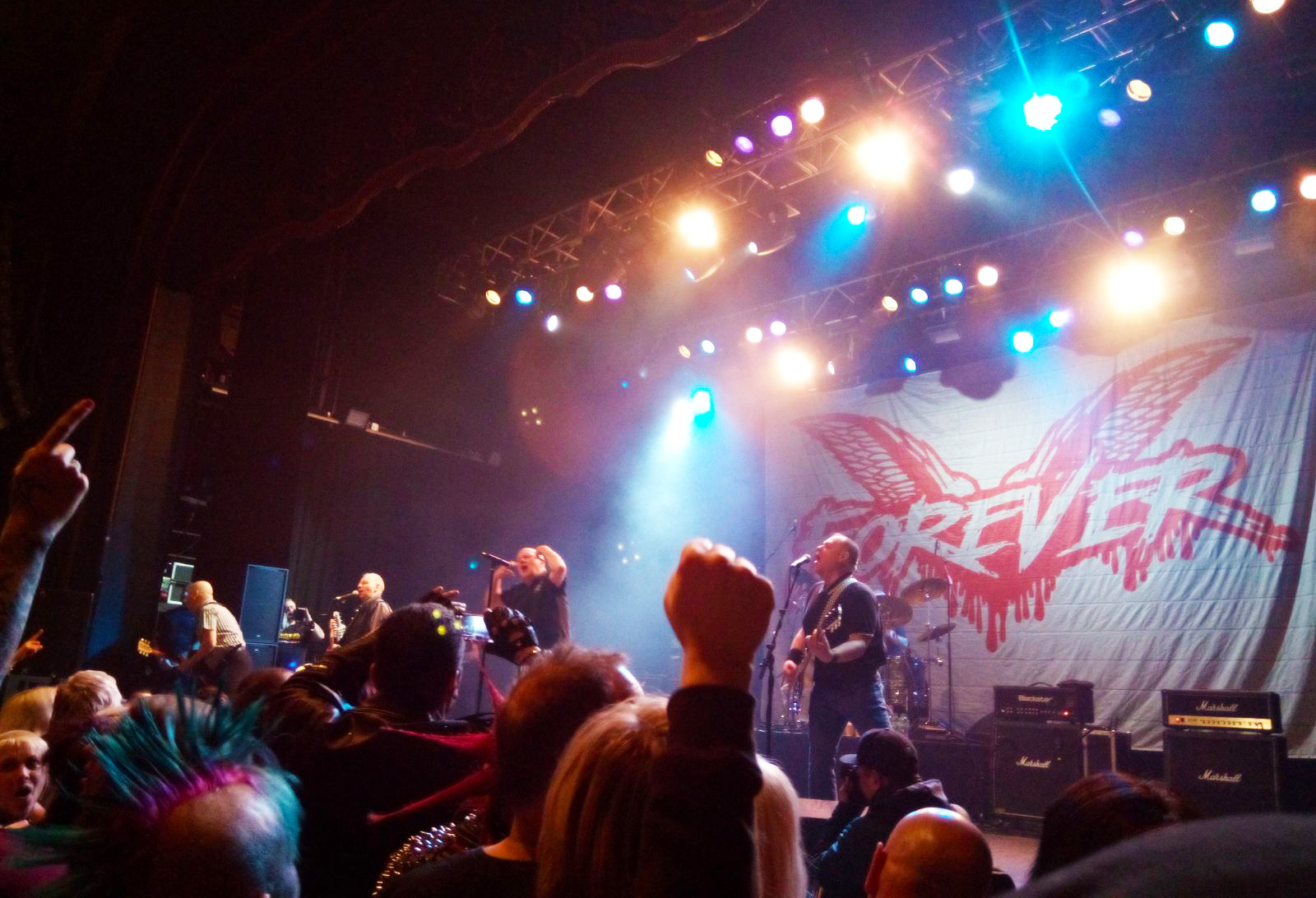 Los siguientes en tomar el escenario fueron Cock Sparrer. Acaban de sacar nuevo disco, ‘Forever’, después de su ‘Here we stand’, en 2007 . El concierto, de hecho, estaba anunciado en la sala como Cock Sparrer & Friends, fiesta de presentación de su álbum. Algo parecido a lo que presenciamos en Noviembre de 2007, en Wolverhampton, el todopoderoso editor de esta revista online, el Lehendakari y servidor. Nada ha cambiado desde entonces en el sonido de la banda. Este último disco es menos interesante, y aunque tenga tres buenos temas sueltos (‘Gonna be alright’, ‘Us against the world’ y ‘One by one’), son menos que en el anterior vinilo. Es exactamente el mismo royo que ‘Here we stand’, fórmula coreable y ganadora, y casi todos contentos. No mucho que comentar sobre su directo ya que el repertorio y ejecución son siempre los mismos. Venían rodados de una gira por Europa y Estados Unidos por lo que la pancarta de fondo era el logotipo del grupo con las letras ‘Forever’, como la portada del álbum.
