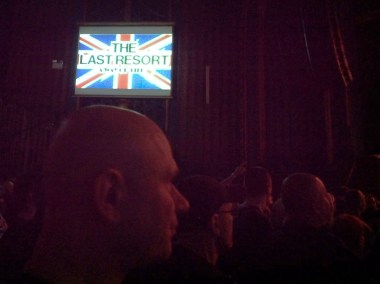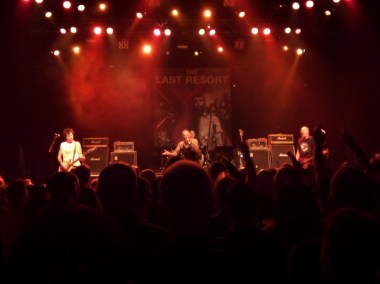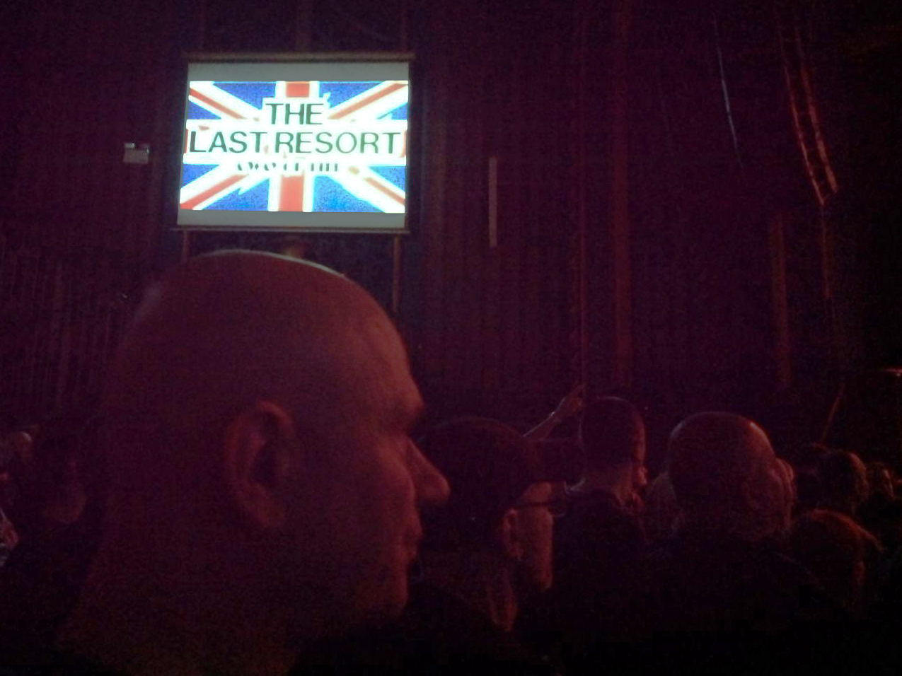 El ambiente estaba ya a punto de alcanzar el clímax en el descanso, antes de salir The Last Resort. Recuerdo un jovenzuelo colgando una bandera gigante de San Jorge en los balcones de uno de los laterales de la sala, siendo amonestado por los gorilas de seguridad. La organización puso dos pantallas gigantes a los lados donde se podía ver el logotipo del grupo que estaba tocando en cada momento. Los siguientes en subirse al escenario añadieron su propia pancarta en el centro, que fue la portada de su último álbum ‘This is my England’ donde se podía ver un rapado cargando su propia cruz, varios policías y, al fondo, un council state, todo gris y lluvioso. En las pantallas gigantes se veía la Union Jack con el nombre del grupo. De repente, como si fueran a salir los mismísimos Sisters of Mercy la sala se llena de humo para dar la bienvenida a Roi Pierce y compañía, que comienzan con la susodicha ‘This is my England’, y ya sin parar, ni charlar entre canciones, hasta el final. Este disco tiene muchos temas pegadizos y se nota que ha calado entre sus seguidores. Pensé que el momento más esperado sería su hit ‘Violence in our minds’, pero para mi sorpresa, la canción más coreada es de su último disco: ‘We are invincible’. Impecable trabajo el del guitarra Fish dándole un toque melódico a casi todas las canciones, sin perder el royo machacón Oi ochentero que tanto gustó a la parroquia allí congregada.