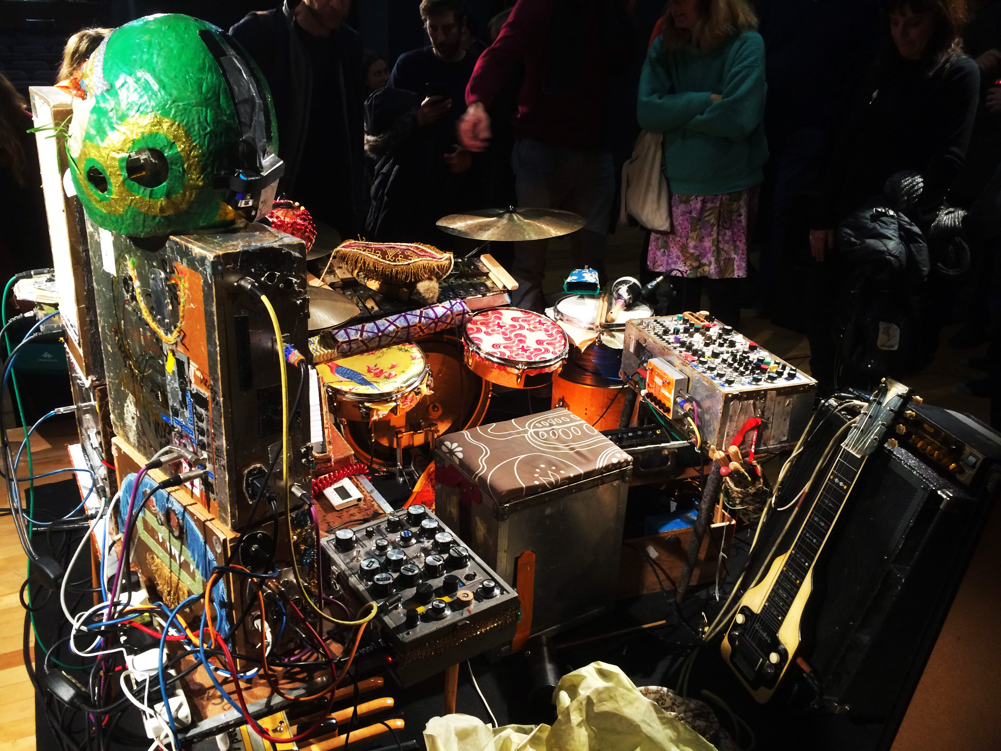 Al finalizar la actuación pudimos acercarnos a charlar con él y a contemplar los prodigiosos instrumentos DIY que traía consigo. Una pasada.
