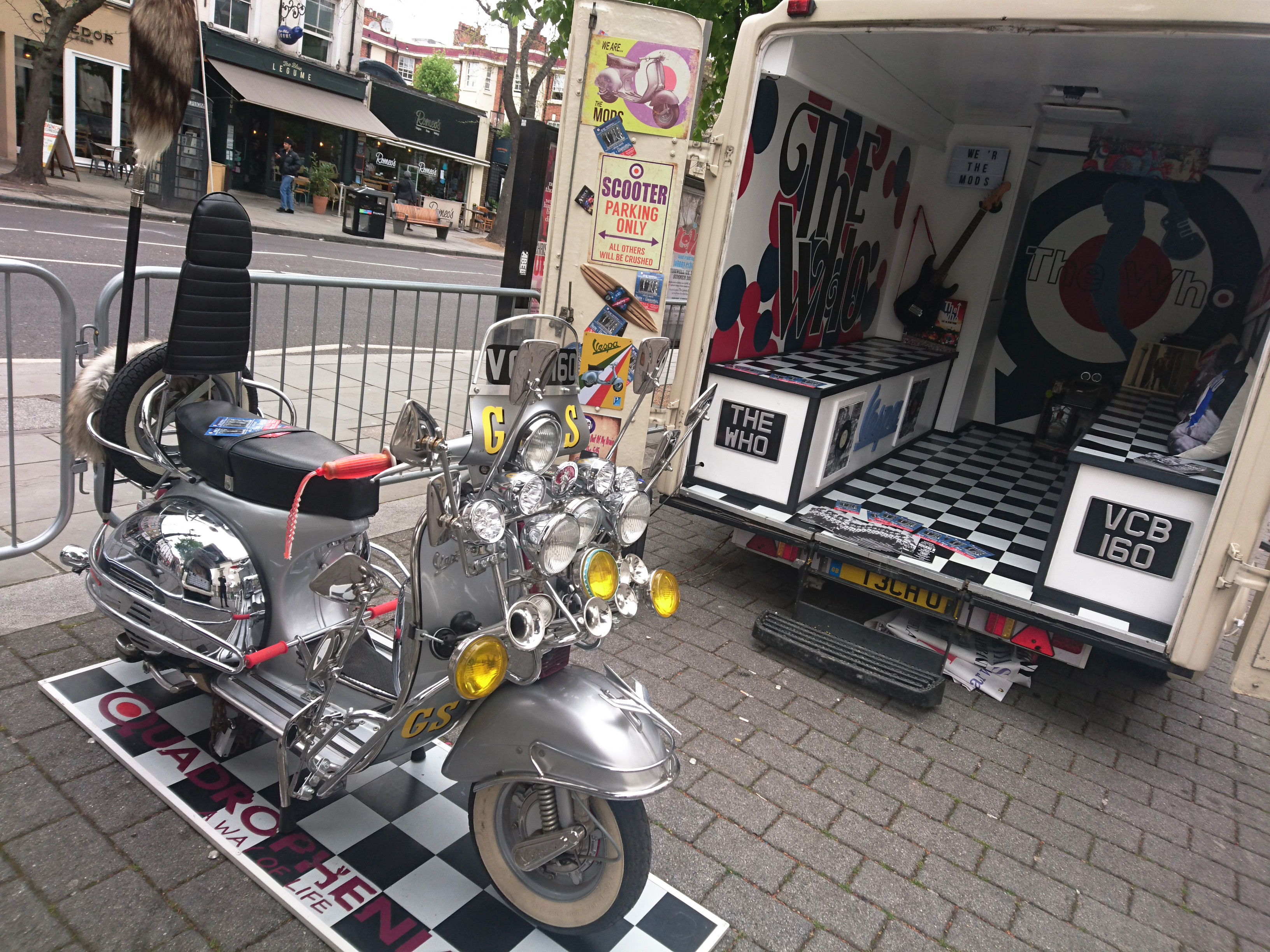 Al terminar estos, salimos a respirar un poco a la zona habilitada en el exterior con un par de caravanas con parafernalia mod, incluyendo una réplica de la moto utilizada en película Quadrophenia. También había puestos de comida y el ambiente era muy distendido ya que había mucho menos postureo del esperado y más reencuentros de gente que vivió ese momento de redescubrir y adaptar lo mod a finales de los 70. Conocimos un glory boy original y charlamos con el cantante de Small World que se encontraba como público. Como cambia la película de leer libros e información de segunda mano que escuchar las bromas de los que sí que estuvieron allí…. De entre los puestos que vendían música, ropa y demás, destacaría un libro que se acaba de editar este año llamado ‘Modzines, 1978-84: Fanzine Culture from the Mod Revival’. Es una recopilación hecha por el mismo Eddie Piller y Steve Rowland de los principales zines de la epoca.